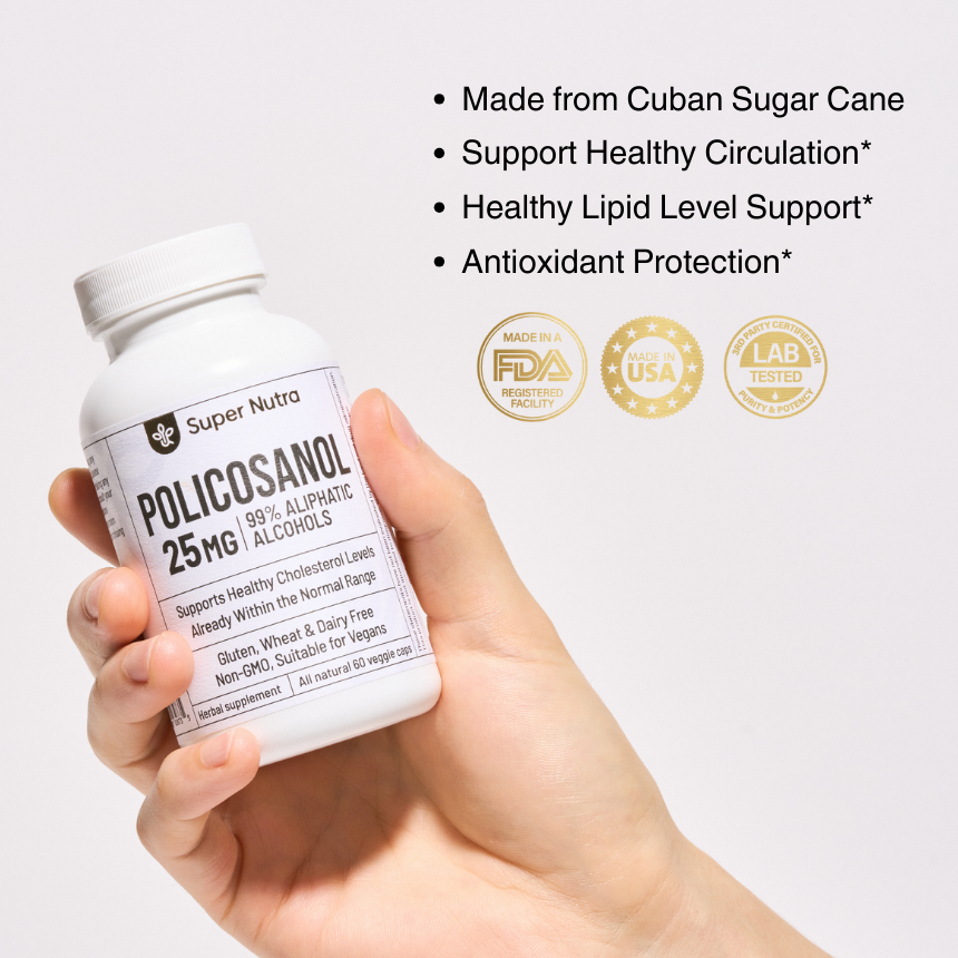 With 25mg per serving, Super Nutra’s Policosanol supplement works harder for you. The compound works by inhibiting the synthesis of cholesterol in the liver, supporting better blood flow and overall wellness. With over a decade of clinical research supporting its safety and tolerability, Policosanol has earned its reputation as the best cholesterol supplement on the market.